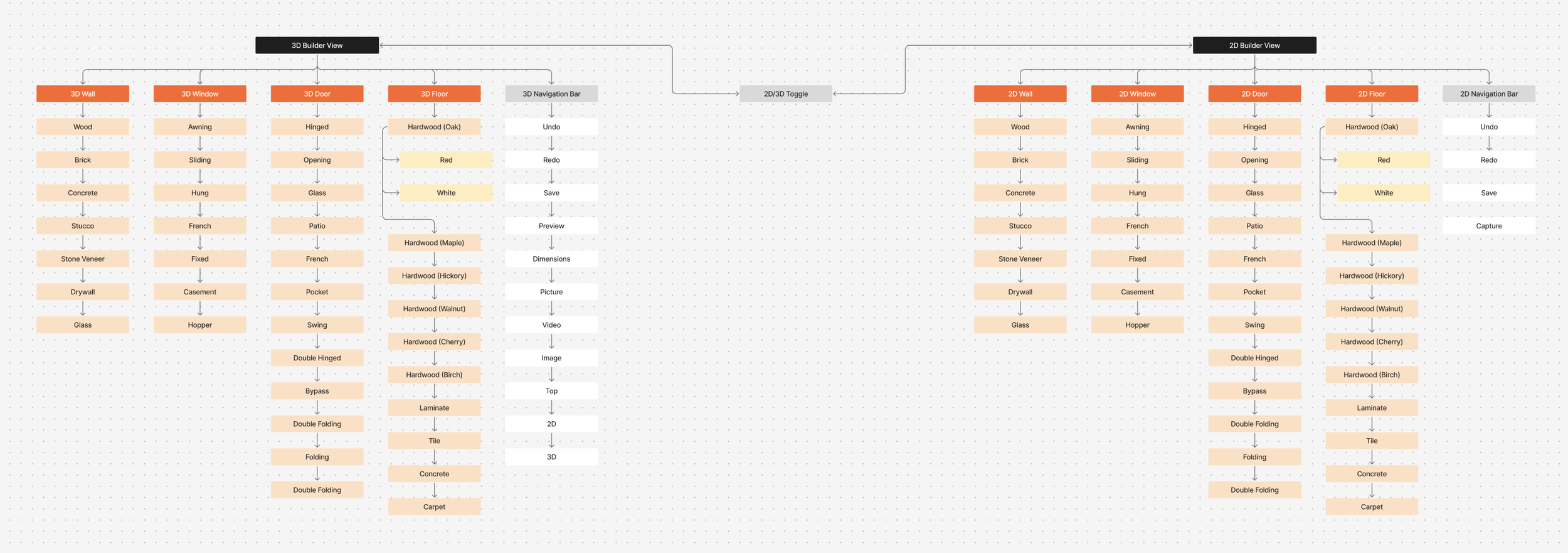 To visualize how users interact with key features, I mapped out task flows for building a new room and switching between 2D and 3D views. These flows highlight the step-by-step journey users take, helping ensure the interface supports a smooth and intuitive experience.