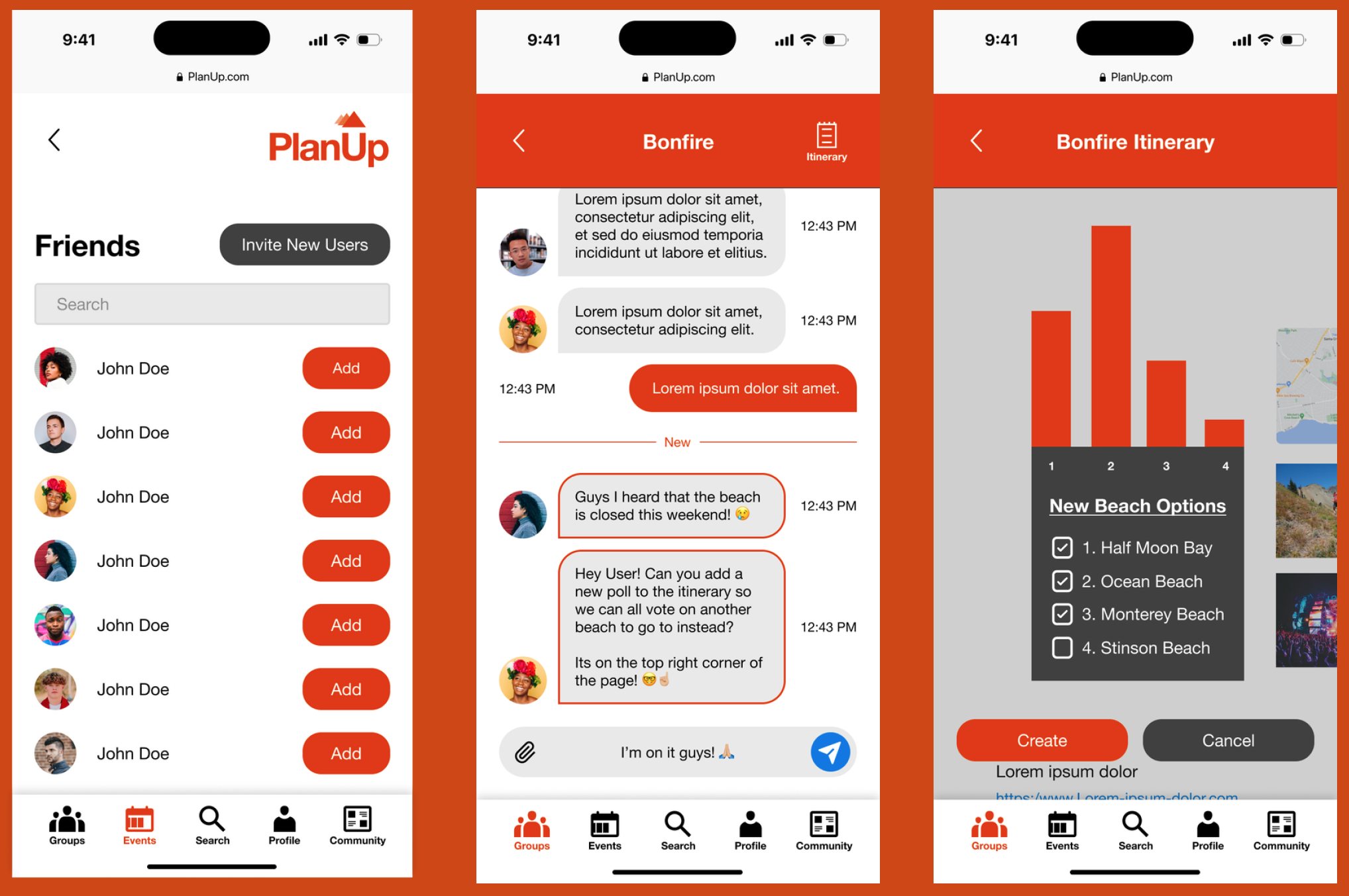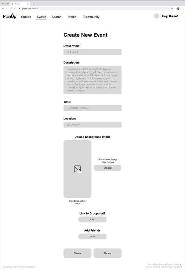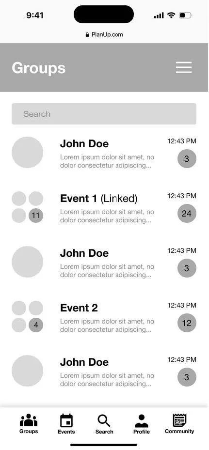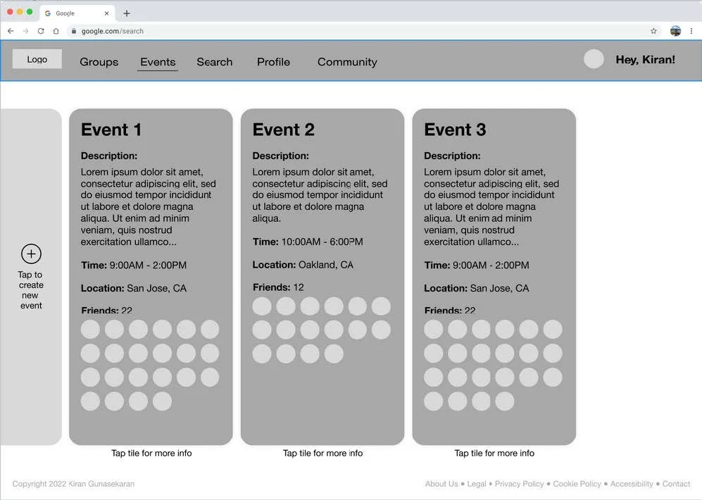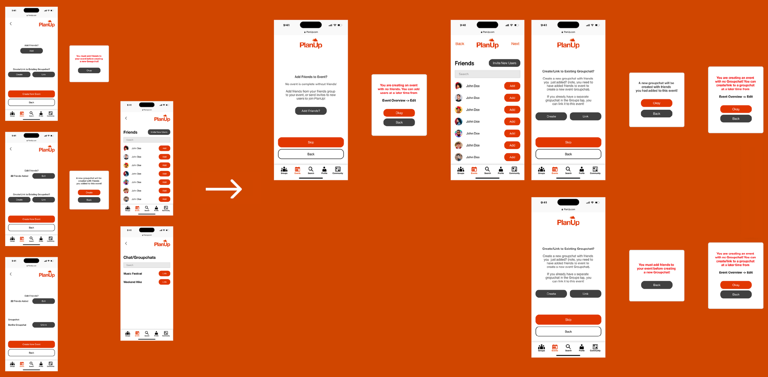 - The navigation for Add Friends and Create/Link to group chat was simplified by breaking down the process into more steps. Though this did make the create new event process a bit longer, it was a worthwhile trade-off as it made the create new event process far simpler.