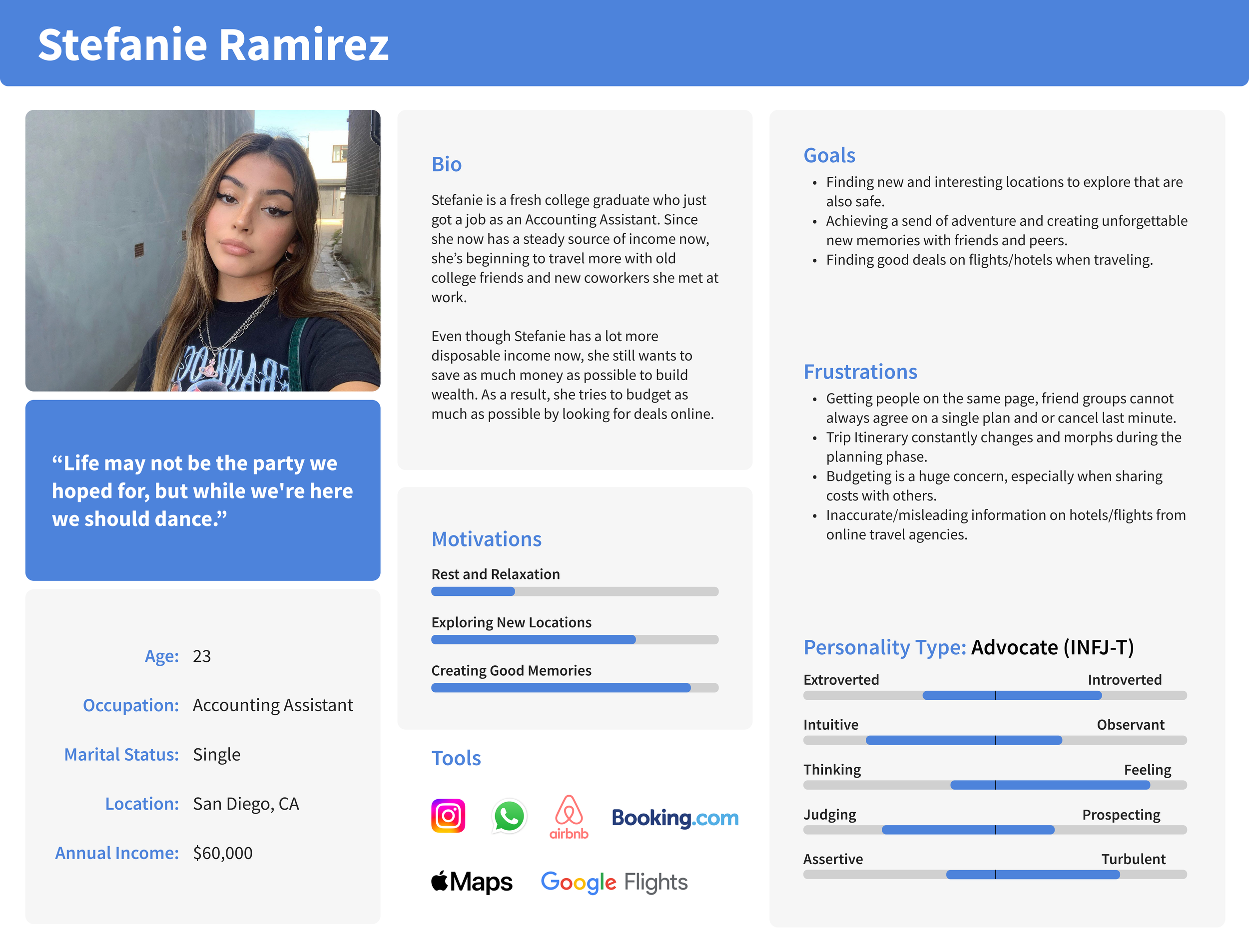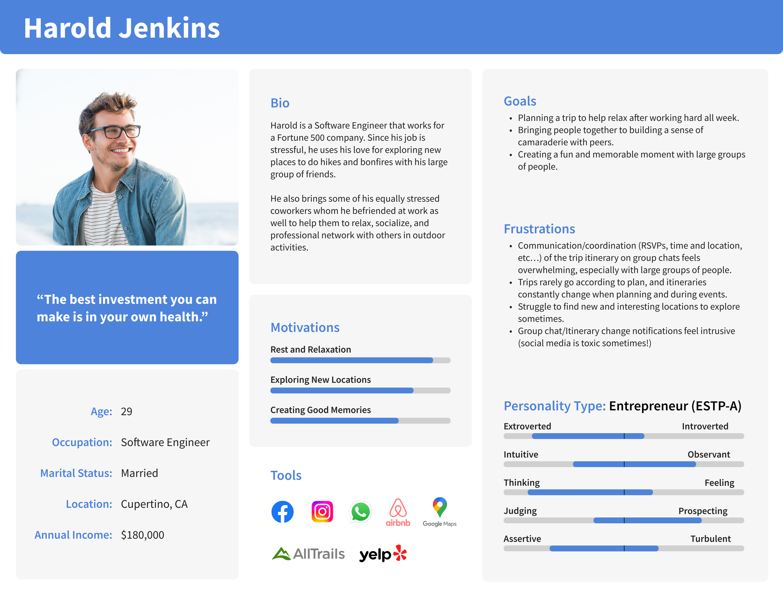 Finally, after all the User research, Affinity Mapping, POV’s and HMW’s I crafted two Personas to better help me to emphasize with my Users. The first persona is an outdoorsy and adventurous young professional, and the second persona is a younger individual who loves to travel frequently with friends but is more budget-conscious.
